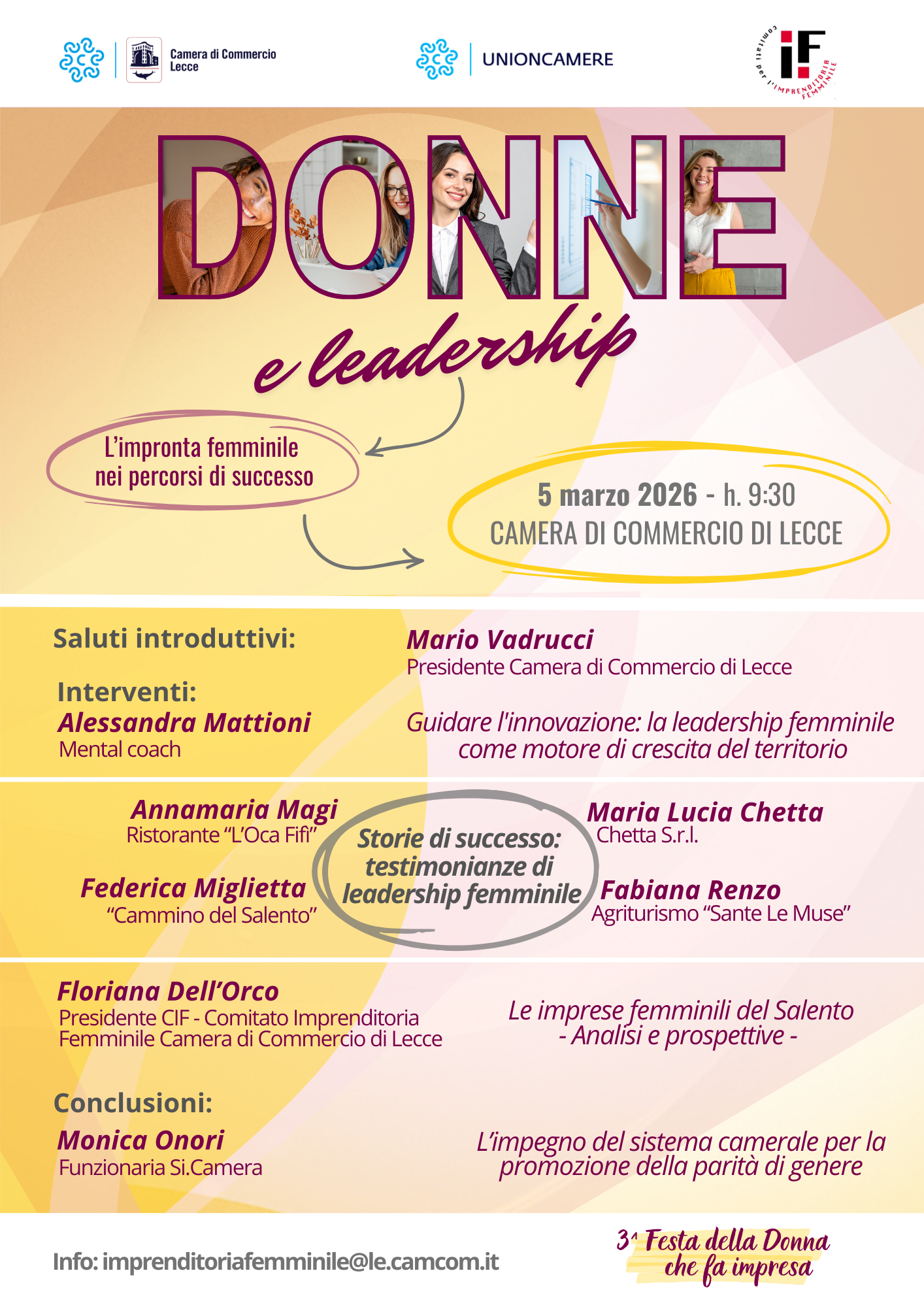 La 3^ edizione della “Festa della donna che fa impresa” si terrà il giorno 5 marzo 2026, alle ore 9:30, presso la Sala Urso della Camera di Commercio di Lecce, in viale Gallipoli, 39.