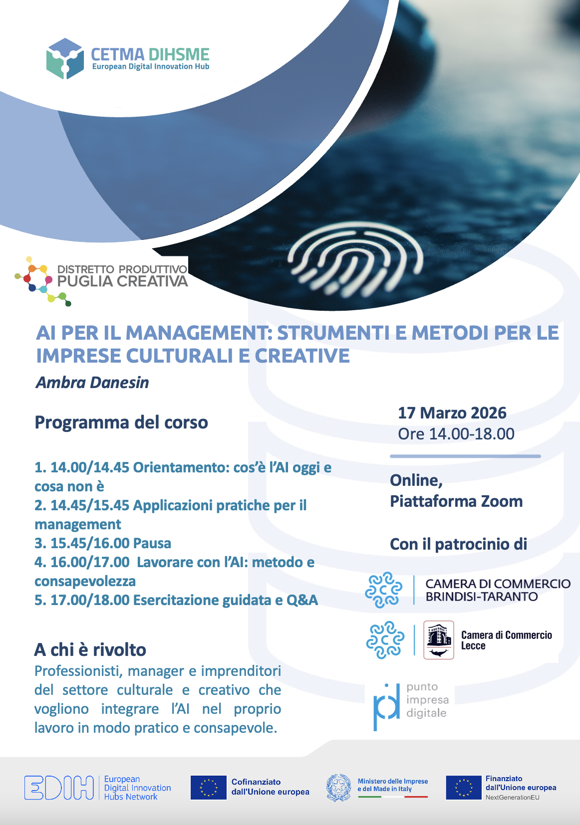 Il PID - Punto impresa digitale della Camera di Commercio di Lecce, comunica che il prossimo 17 marzo 2026 alle ore 14.00, nell'ambito dei servizi offerti dal CETMA DIHSME European Digital Innovation Hub, si terrà il corso dal titolo "AI per il management: strumenti e metodi per le imprese culturali e creative" rivolto a professionisti, manager e imprenditori del settore culturale e creativo.