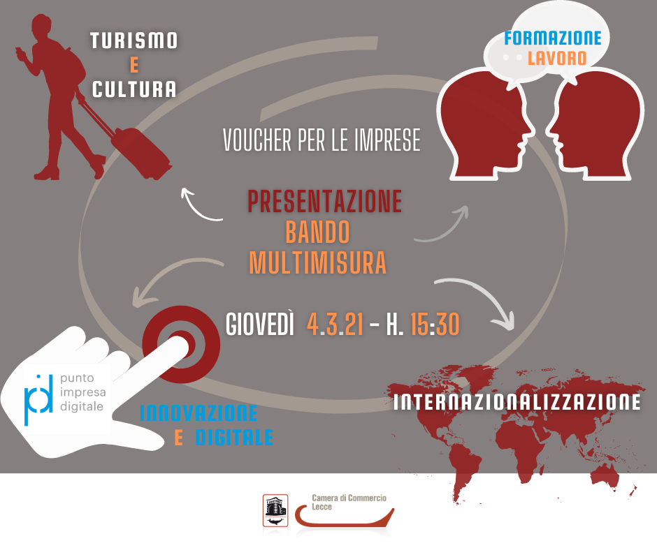 Nel webinar di presentazione del Bando, organizzato in collaborazione con la struttura del PID (Punto Impresa Digitale) della Camera di Commercio di Lecce, per il prossimo 4 marzo 2021 a partire dalle ore 15.30, saranno illustrati i dettagli per accedere ai voucher.