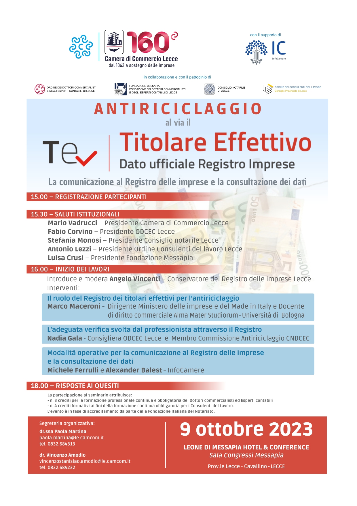Per illustrare la nascita del Registro dei titolari effettivi, i relativi obblighi di comunicazione al Registro delle imprese e la consultazione dei dati, la Camera di commercio di Lecce - con il supporto di InfoCamere (società consortile di informatica del sistema camerale), in collaborazione e con il patrocinio dell'Ordine dei Dottori Commercialisti e degli Esperti Contabili della Provincia di Lecce, del Consiglio notarile di Lecce e dell'Ordine dei Consulenti del Lavoro, ha organizzato un seminario che si terrà il prossimo 9 ottobre 2023, a partire dalle ore 15.00, presso la Sala congressi Messapia - LEONE DI MESSAPIA Hotel & Conference - Prov.le Lecce Cavallino, LECCE.
