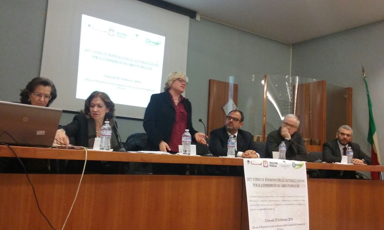 La Camera di Commercio di Lecce in collaborazione con la Regione Puglia e con le Associazioni di categoria Confcommercio e Confesercenti, ha organizzato oggi 25 febbraio 2016 una giornata di studio sulle rinnovo delle autorizzazioni per il commercio su aree pubbliche di tipologia A), in considerazione della scadenza non troppo lontana di tali autorizzazioni.