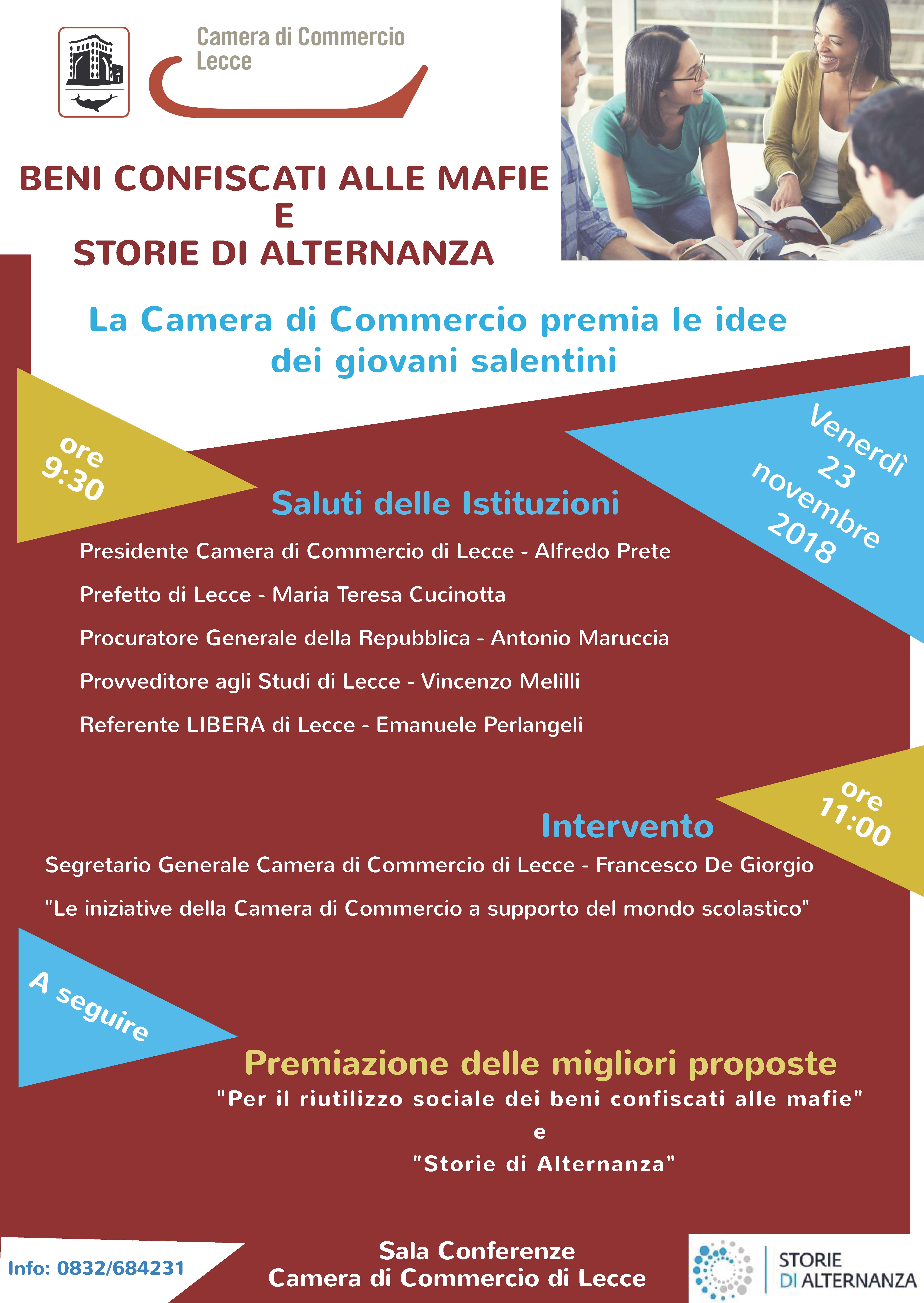 Il 23 novembre 2018 a partire dalle ore 9.30 si terrà, presso la Sala Conferenze dell’Ente camerale, la premiazione delle migliori proposte presentate dagli studenti salentini che hanno partecipato al bando Storie di Alternanza e al bando per la raccolta di proposte per il riutilizzo sociale dei beni confiscati alle mafie.
