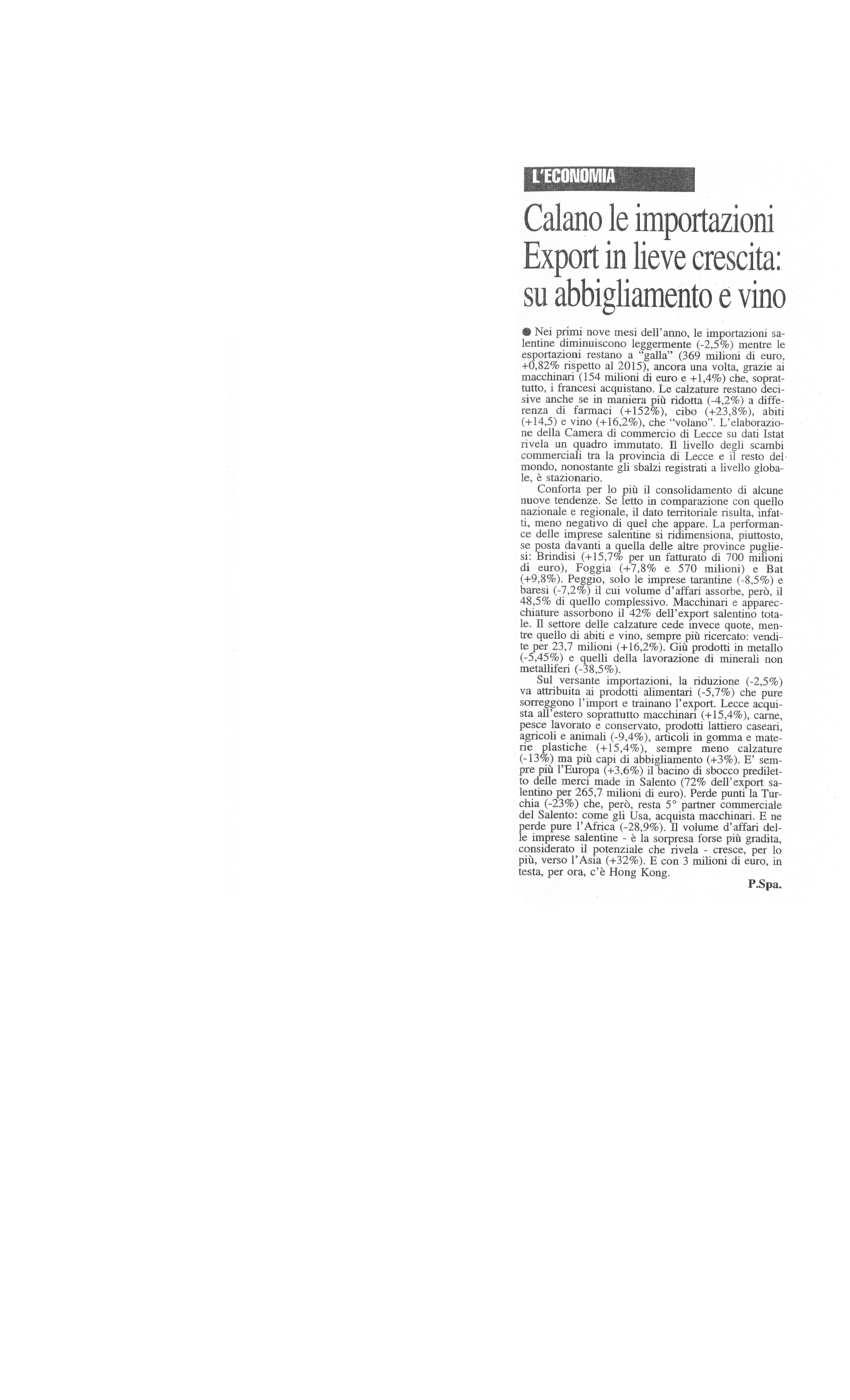 La Gazzetta del Mezzogiorno 23/12/2016 "Esportazioni in lieve aumento"
