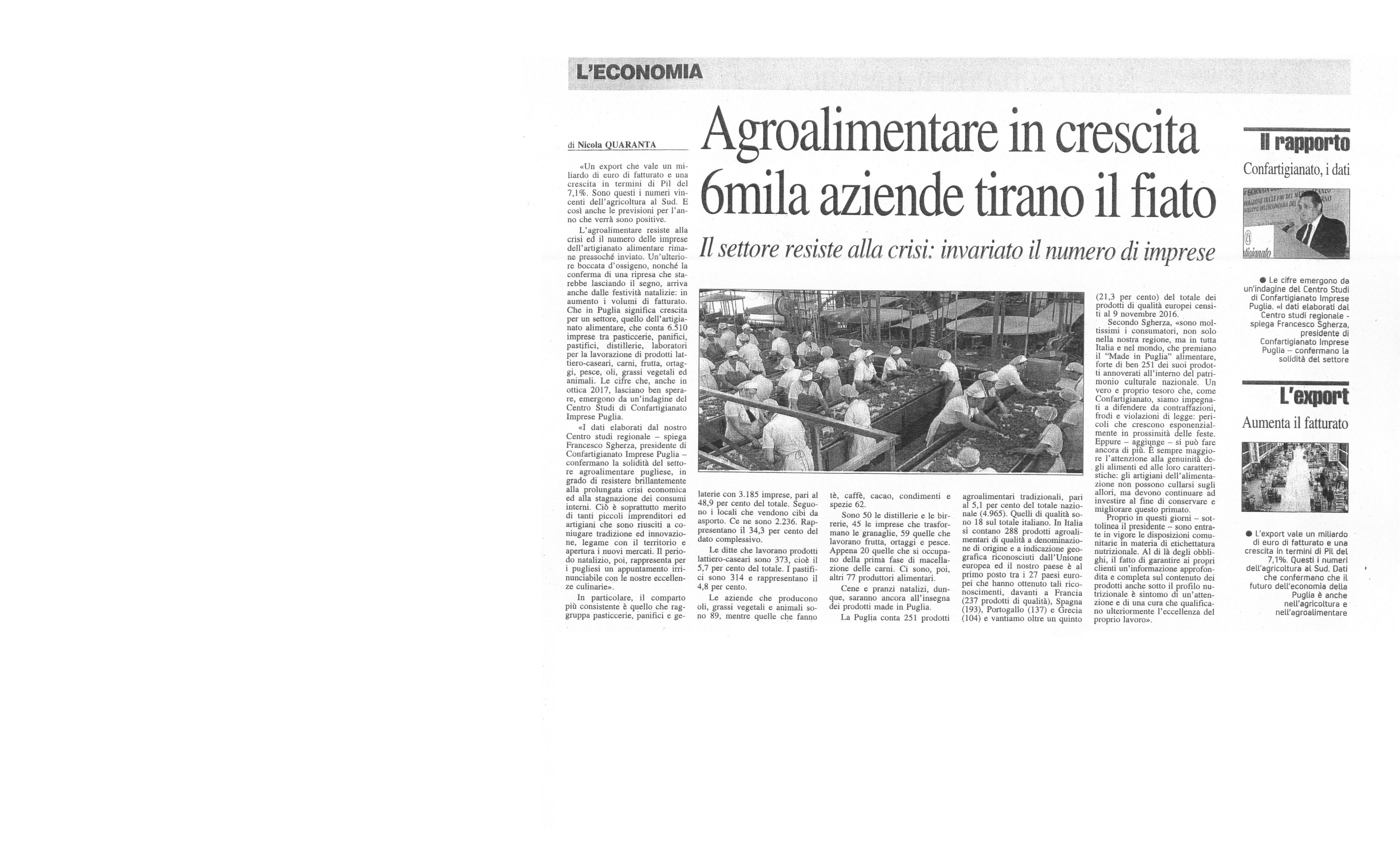 Nuovo Quotidiano di Puglia 23/12/2016 "Agroalimentare in crescita 6mila aziende tirano il fiato"