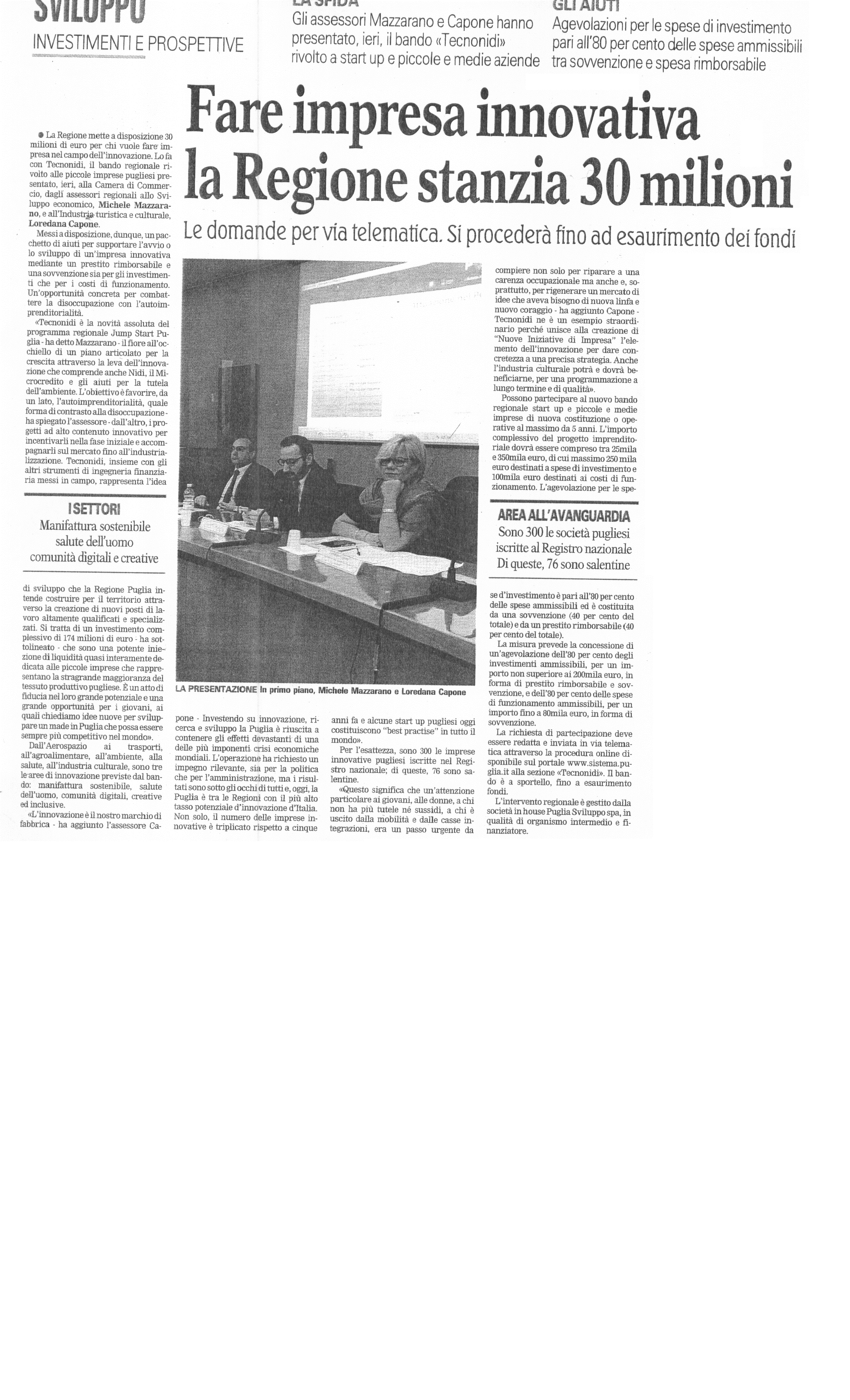 La Gazzetta del Mezzogiorno 14/11/2017 "Fare impresa innovativa la Regione stanzia 30 milioni"