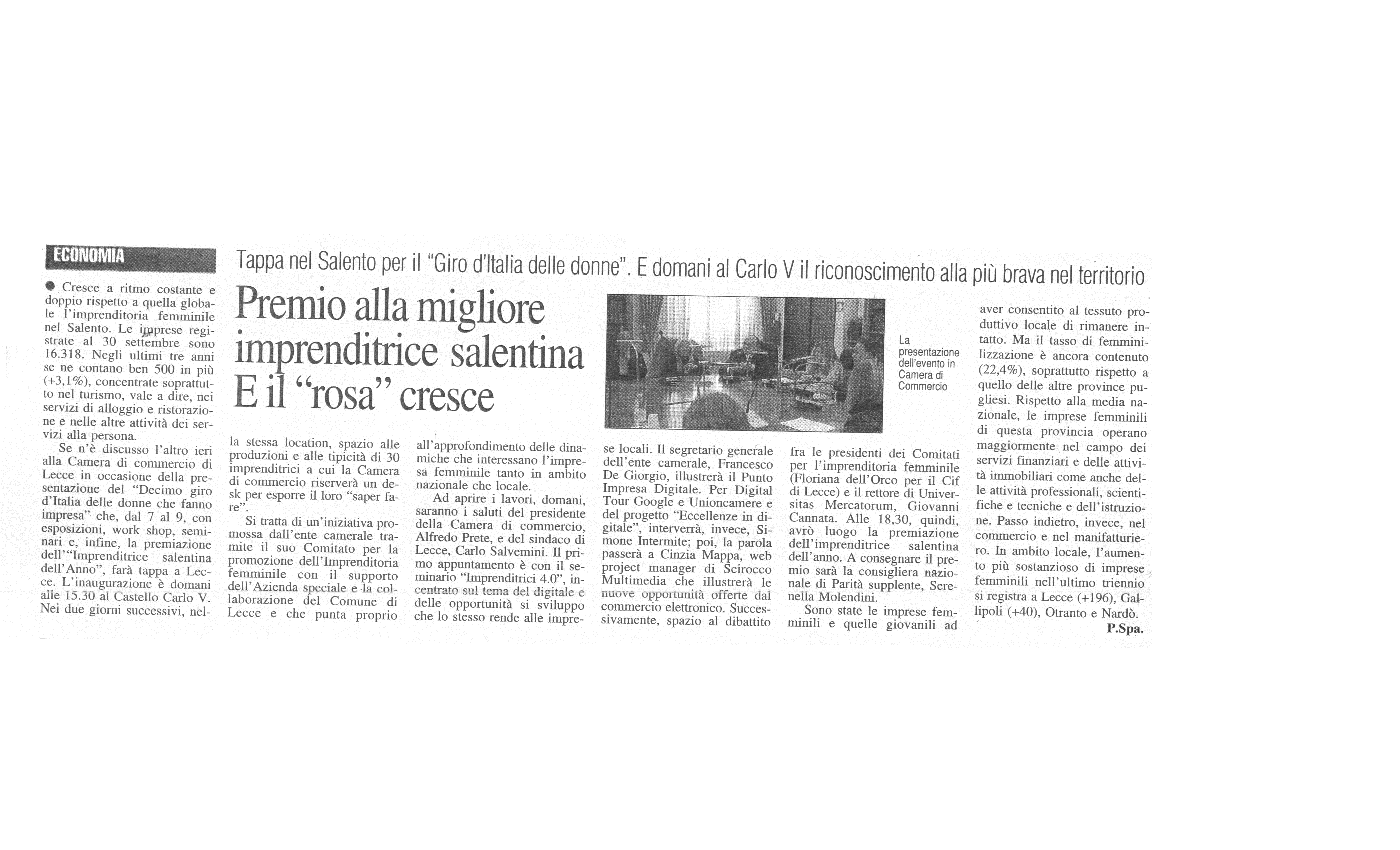 Nuovo Quotidiano di Puglia 26/04/2017 "Aziende al femminile: ora la sfida è un premio 'Pronte a crescere'"Nuovo Quotidiano di Puglia 06/04/2017 "La Start up è femmina 'Un nuovo premio per le imprese rosa'"