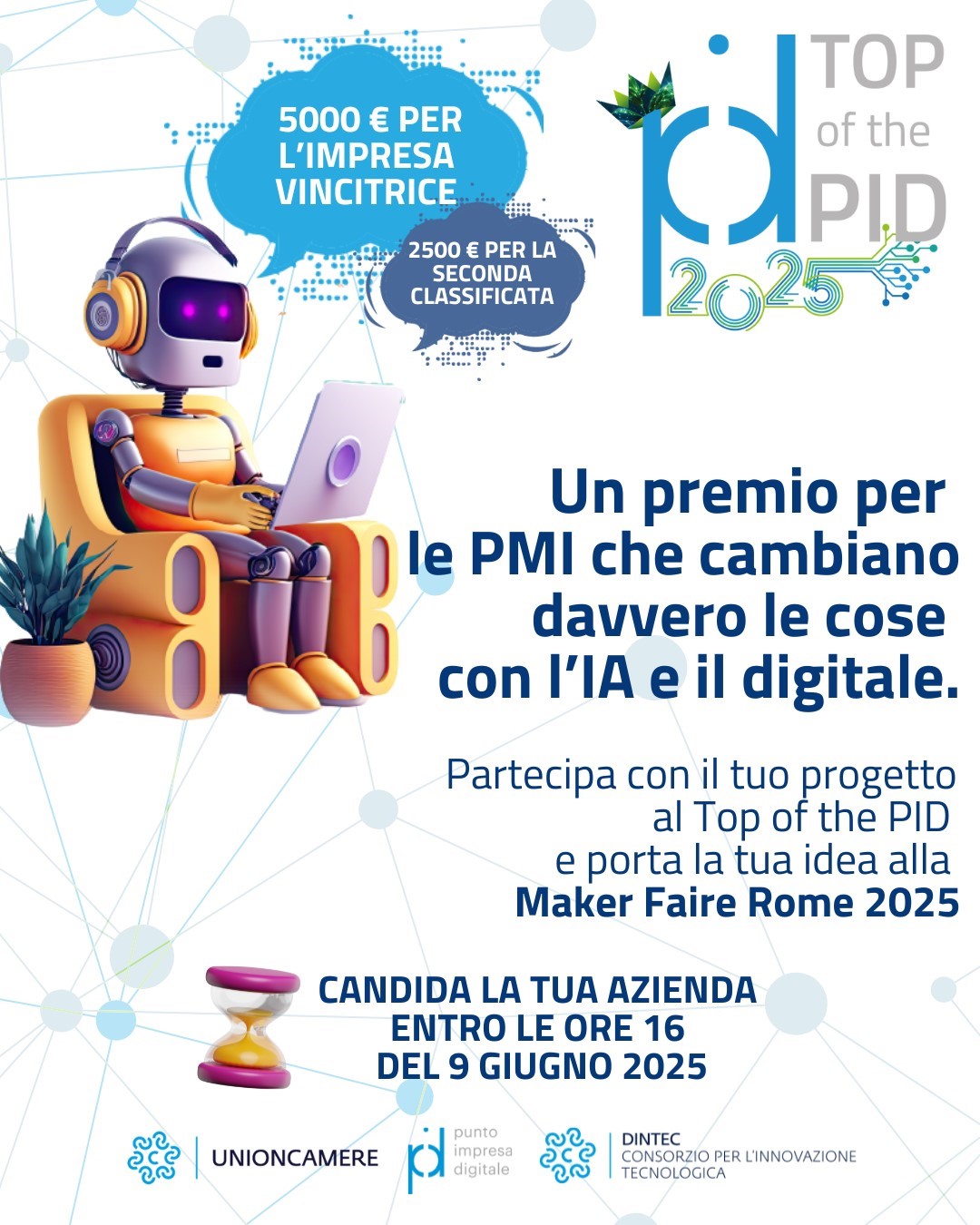Il premio Top of the PID 2025 è un’iniziativa organizzata e promossa da Unioncamere nell’ambito dei servizi offerti dai PID - Punti Impresa Digitale delle Camere di commercio per promuovere la diffusione della cultura digitale e sostenibile tra le Micro, Piccole e Medie Imprese (MPMI).