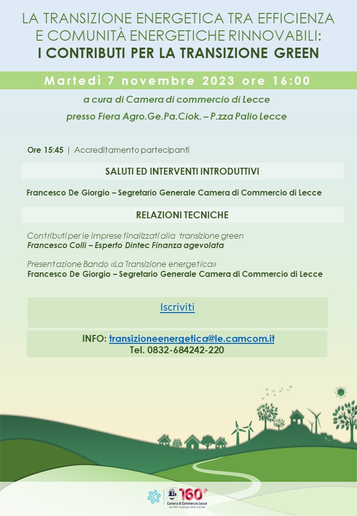 Martedì 7 novembre alle ore 15,45 in occasione della 18a edizione di Agro.Ge.Pa.Ciok, Salone Internazionale della gelateria, pasticceria, cioccolateria e dell'artigianato agroalimentare, si svolgerà un incontro in occasione del quale verranno illustrati i contributi alle imprese per la transizione green e verrà presentato il Bando “La Transizione energetica” finalizzato all’erogazione di voucher a fondo perduto alle imprese salentine. Le imprese interessate potranno ritirare il relativo pass presso la Camera di Commercio - Viale Gallipoli n. 39 - info 0832-684242-220 e-mail transizione energetica@le.camcom.it