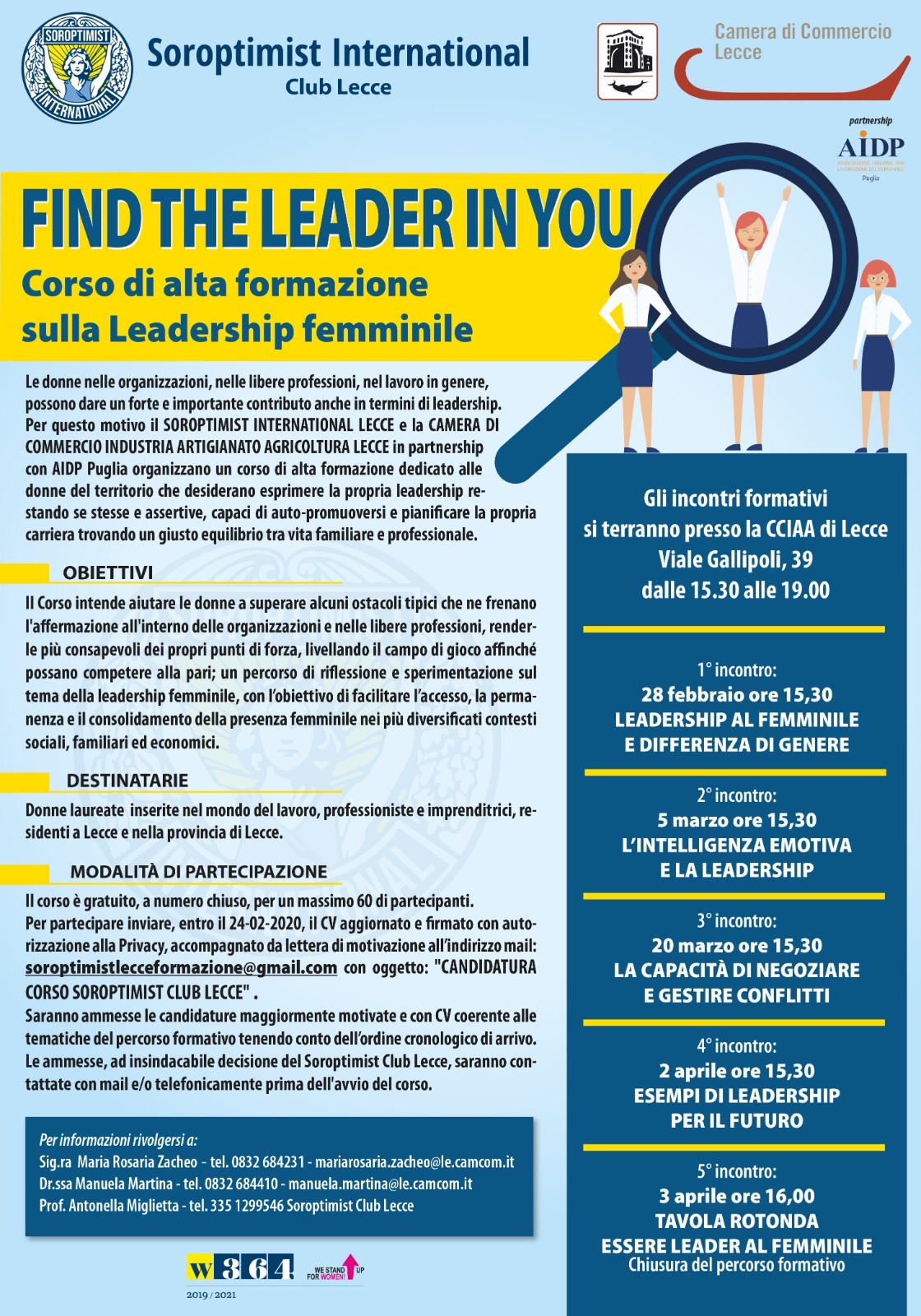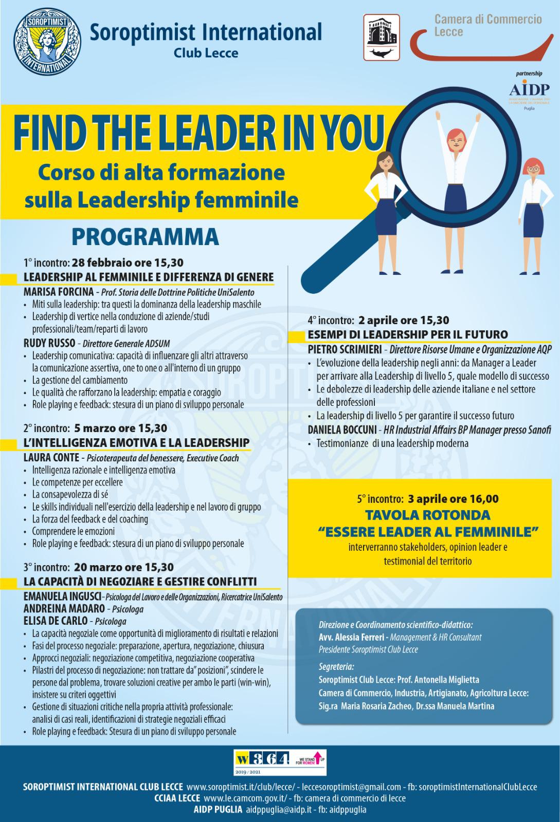 Il Soroptimist International Lecce e la Camera di Commercio di Lecce, in partnership con AIDP Puglia, organizzano il corso gratuito di alta formazione “Find the leader in you” dedicato alle donne del territorio, che tiene conto delle difficoltà specifiche che le donne incontrano nel farsi riconoscere come leader in contesti in cui il modello di leadership prevalente è di impronta maschile.