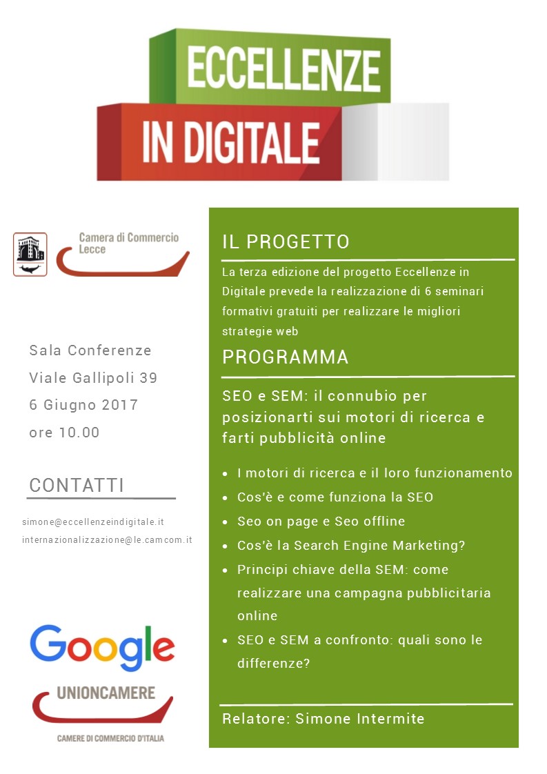 Nuovo appuntamento con Eccellenze in Digitale, martedì 6 giugno si terrà nella Sala Conferenze dell'Ente camerale il quarto seminario dal titolo "SEO e SEM: il connubio per posizionarti sui motori di ricerca e farti pubblicità online". Simone Intermite, relatore del seminario, illustrerà i seguenti argomenti: