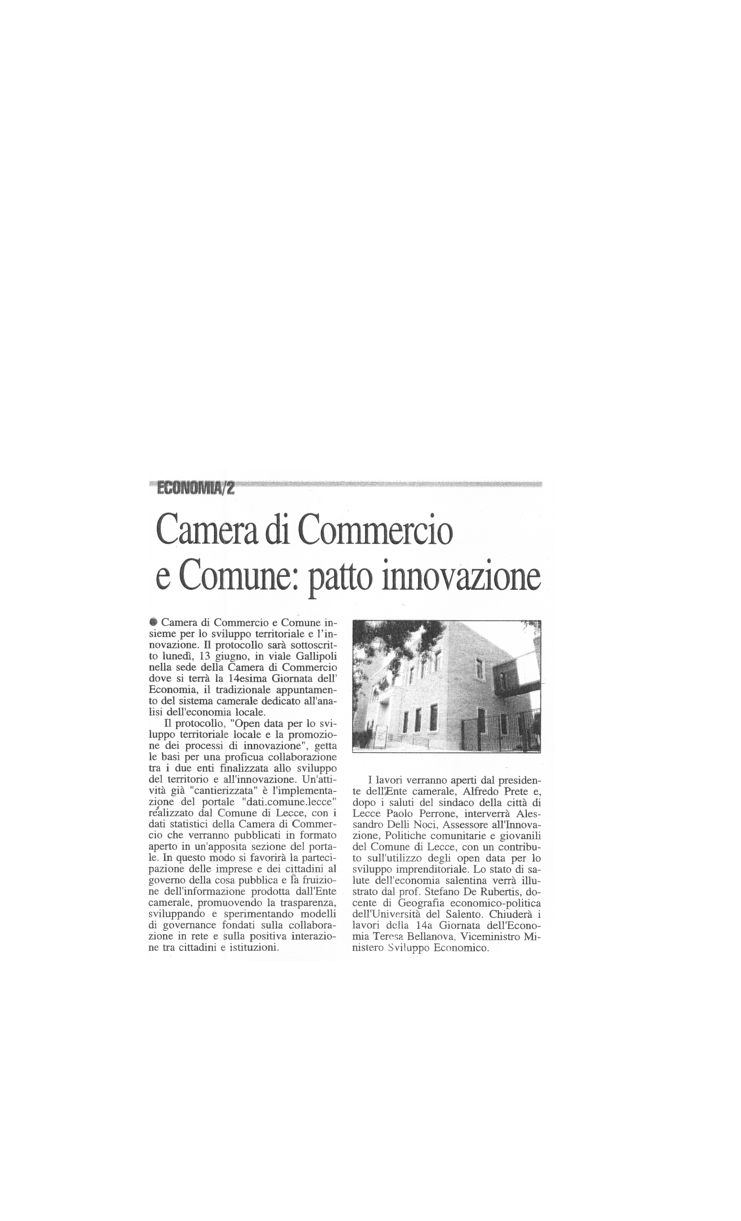 Quotidiano di Puglia 08/06/2016 "Camera di Commercio e Comune: patto innovazione"