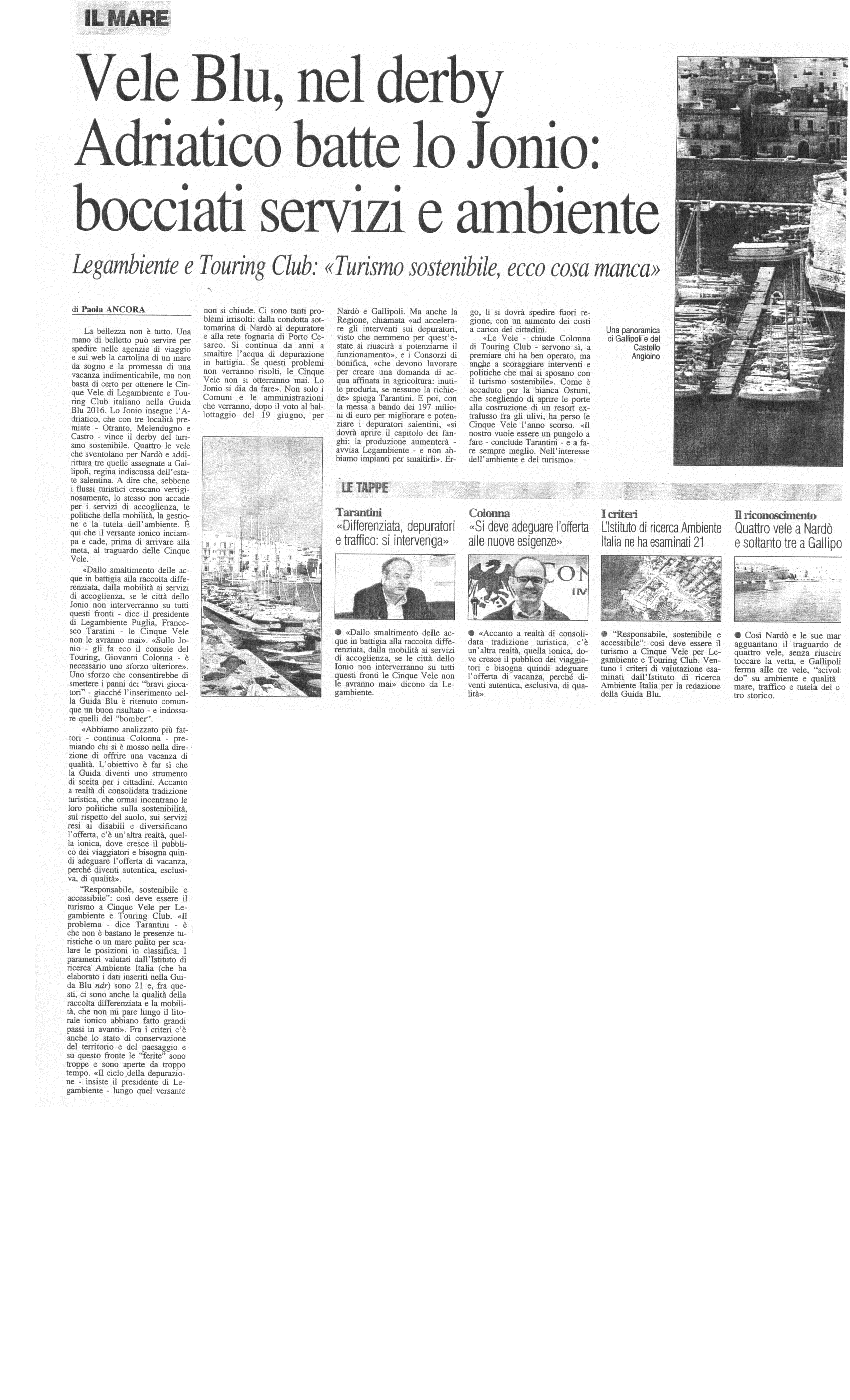 La Gazzetta del Mezzogiorno 11/06/2016 "Puglia, il mare più bello meglio solo la Sardegna
