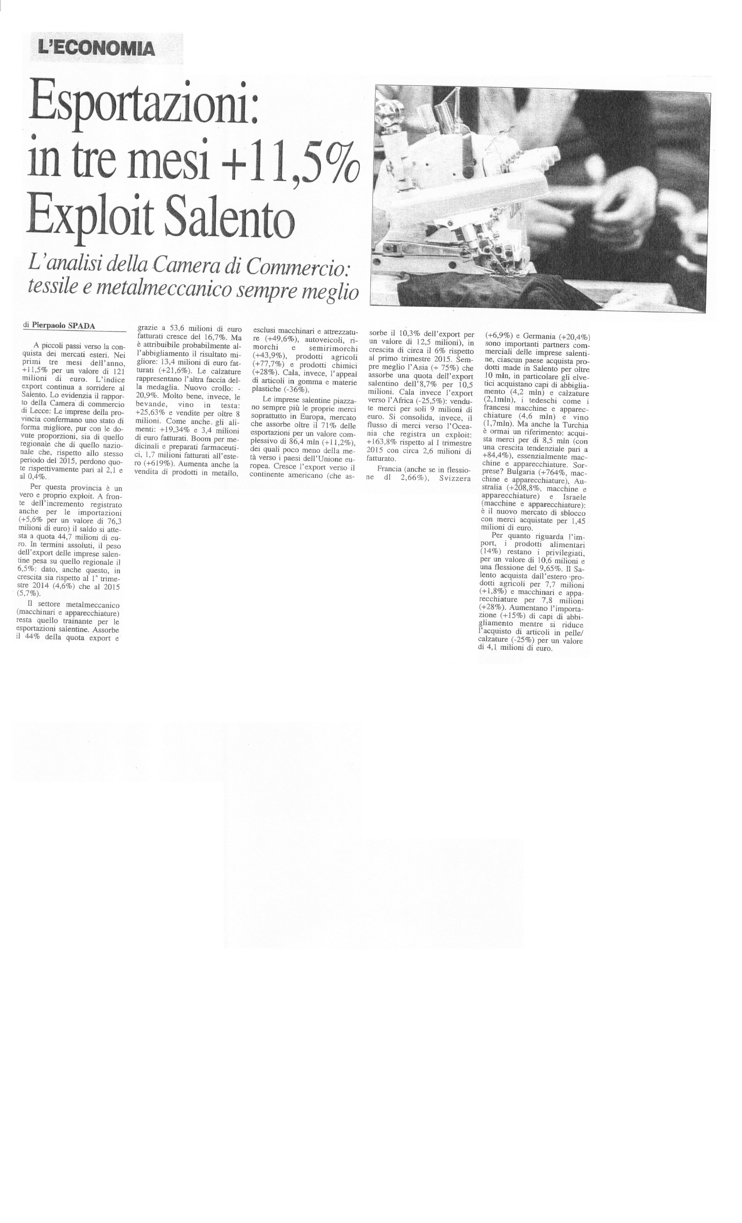 Nuovo Quotidiano di Puglia 23/06/2016 "Esportazioni in tre mesi +11,5%. Exploit Salento"