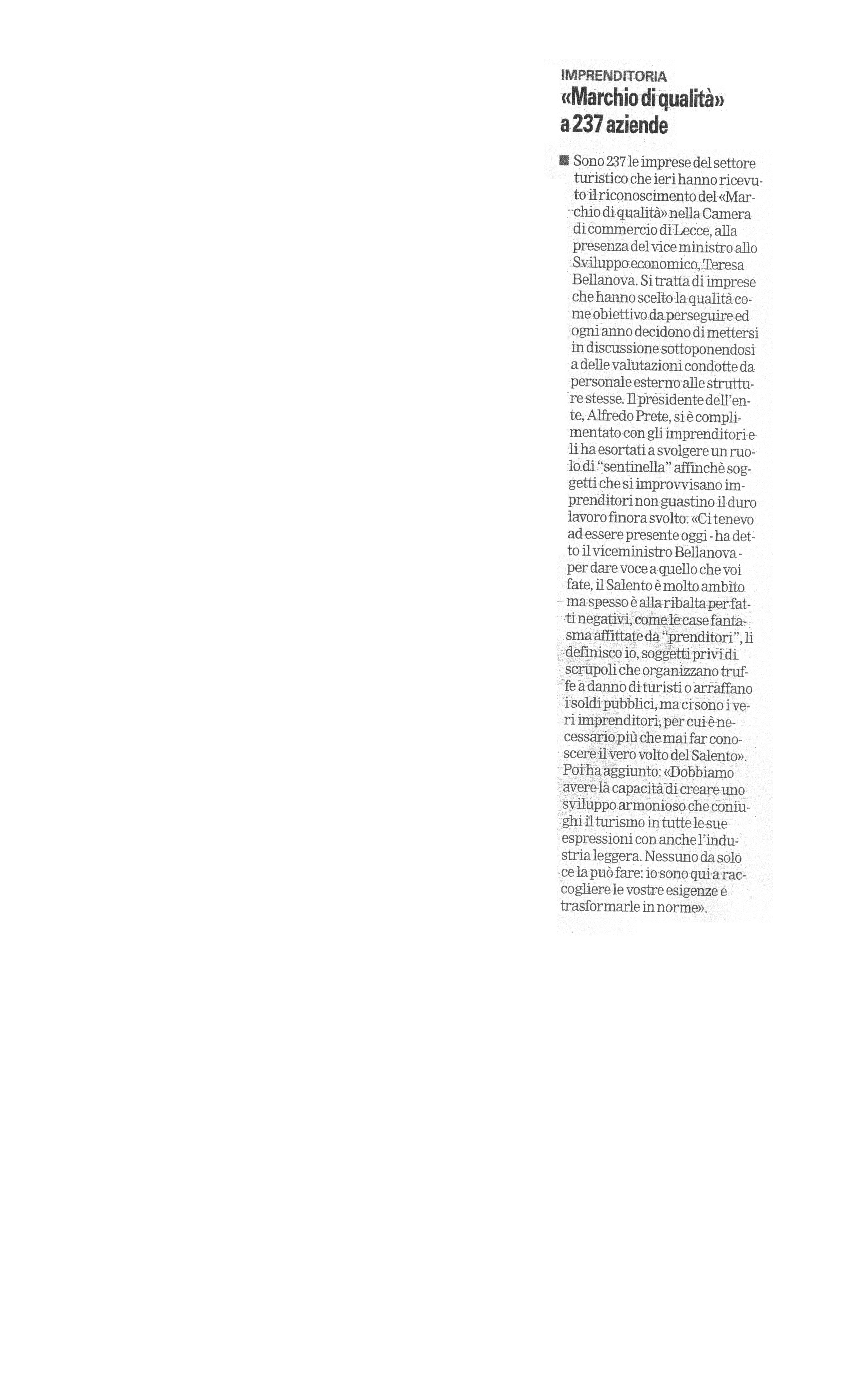 La Gazzetta del Mezzogiorno 26/07/2016 "'Marchio di qualità' a 237 aziende"