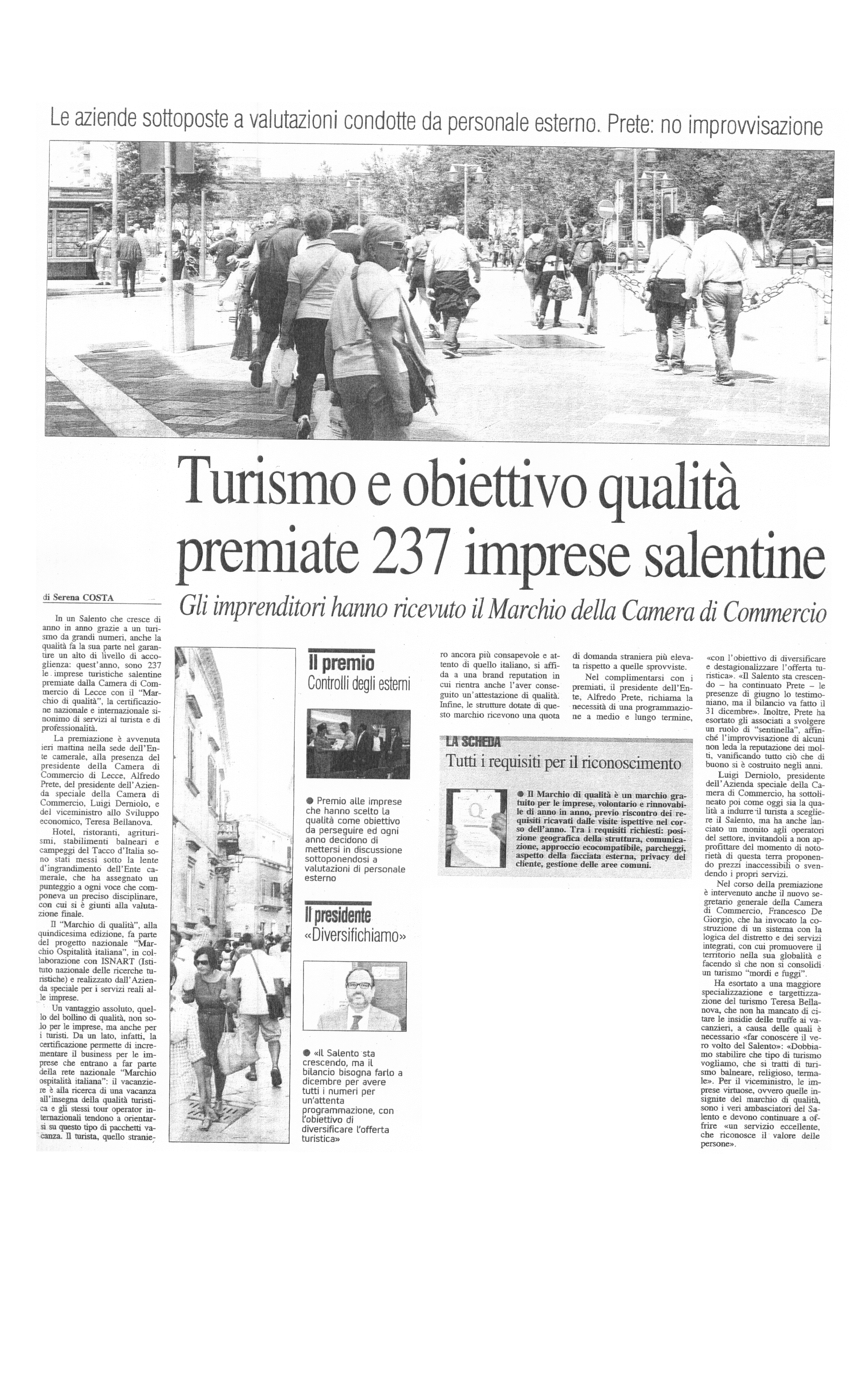 Nuovo Quotidiano di Puglia 26/07/2016 "Turismo e obiettivo qualità premiate 237 imprese salentine"