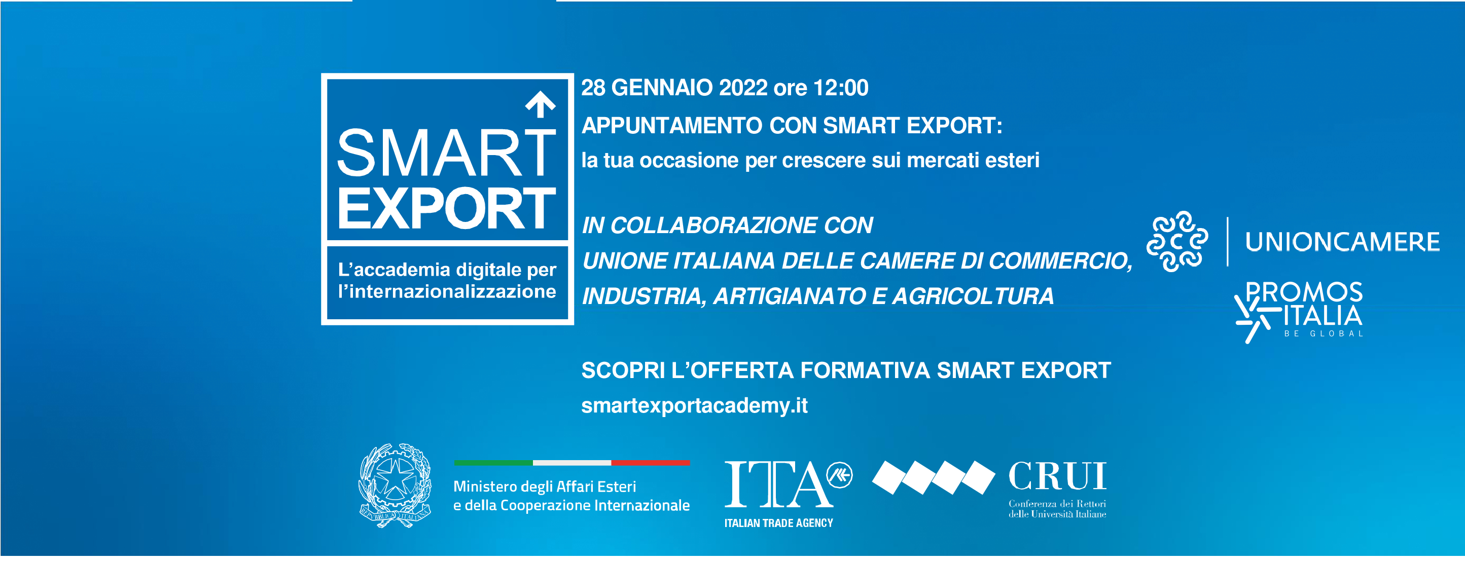 Unioncamere, nell'ambito della collaborazione interistituzionale con il Ministero degli Affari esteri e della cooperazione internazionale e con l'ICE, organizzerà il prossimo 28 gennaio un incontro di presentazione di "Smart Export - Accademia digitale per l'internazionalizzazione" il progetto di formazione online gratuito volto a favorire il processo di internazionalizzazione delle micro, piccole e medie imprese italiane, promosso dal Maeci e realizzato da ICE, dalla Conferenza dei Rettori delle Università Italiane e da cinque Università e Business School: Bologna Business School, Federica Web Learning - Università di Napoli Federico II, Luiss Business School, MIP Politecnico di Milano Graduate School of Business e SDA Bocconi School of Management.