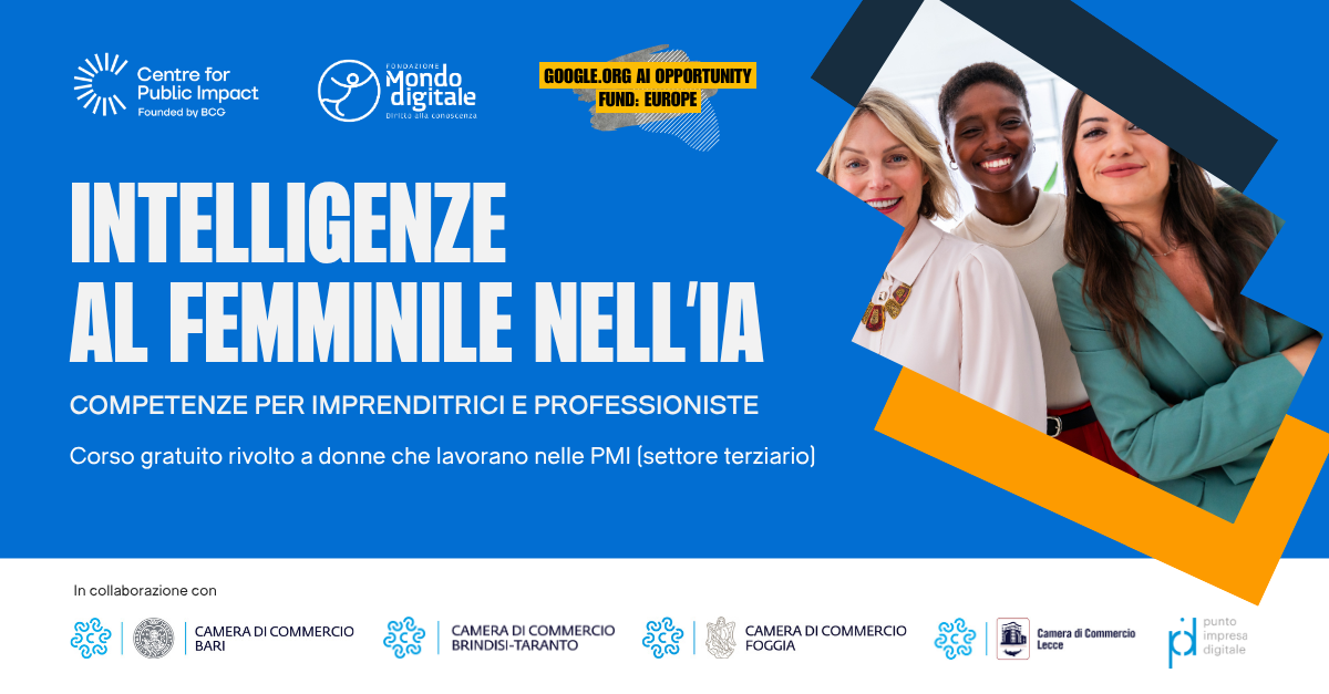Nell'ambito del Google.org AI Opportunity Fund: Europe, in collaborazione sinergica tra la Fondazione Mondo Digitale, le Camere di Commercio di Bari, Brindisi-Taranto, Foggia e Lecce e i rispettivi Punti Impresa Digitale (PID), viene offerto un corso gratuito sull'IA - Google AI Essentials alle donne (imprenditrici e professioniste) che lavorano nelle PMI del settore terziario che fornirà alle partecipanti le conoscenze e l'esperienza pratica necessarie per avere successo nell'attuale mercato del lavoro guidato dall'IA.Il corso si articola in due fasi: