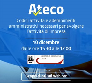 La Camera di Commercio di Lecce, in collaborazione con InfoCamere, organizza un webinar gratuito al fine di illustrare la piattaforma “ATECO” (https://ateco.infocamere.it) e le relative potenzialità di utilizzo da parte delle imprese.