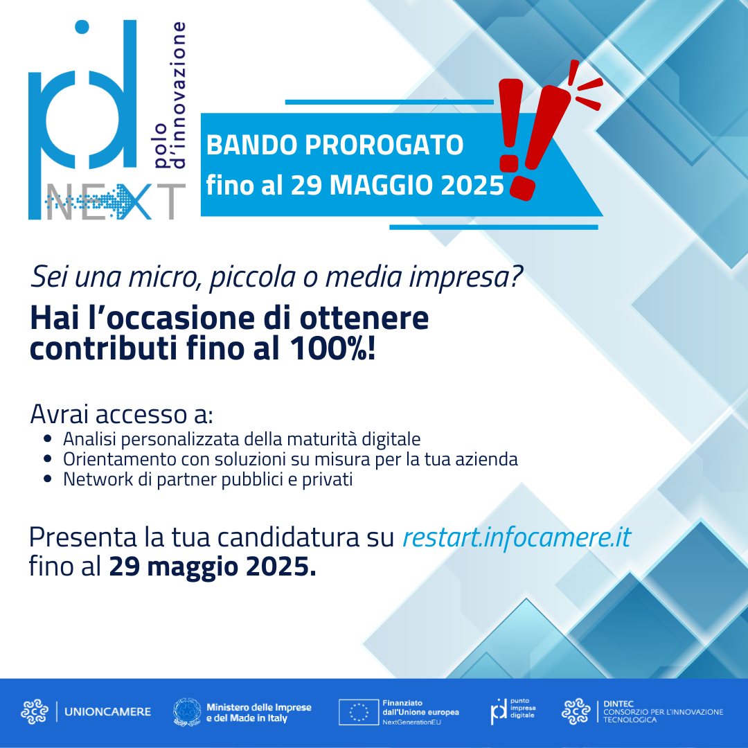 C’è tempo fino alle ore 16 del 29 maggio 2025 per accedere ai servizi messi a disposizione dal Bando PID-Next un'iniziativa finanziata nell'ambito del Piano Nazionale di Ripresa e Resilienza (PNRR) e sostenuta da fondi dell'Unione Europea - NextGenerationEU. A livello nazionale saranno oltre duemila le micro, piccole e medie imprese che potranno accedere a percorsi personalizzati di first assessment digitale e attività di orientamento in grado di supportare la doppia trasformazione: digitale ed ecologica. Il progetto PID-Next, promosso da Unioncamere con il supporto di Dintec, sarà realizzato dai Punti impresa digitale delle Camere di commercio.