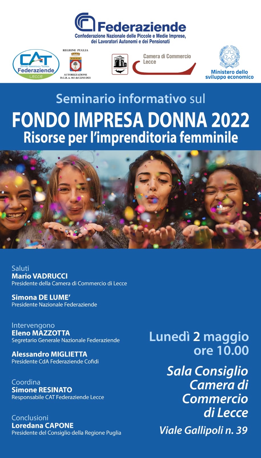 Lunedì 2 maggio 2022, presso la sala del Consiglio camerale, si terrà il seminario informativo sul tema “Fondo Impresa Donna 2022”, organizzato da Federaziende, con il patrocinio del MISE, della Regione Puglia e della Camera di Commercio di Lecce.