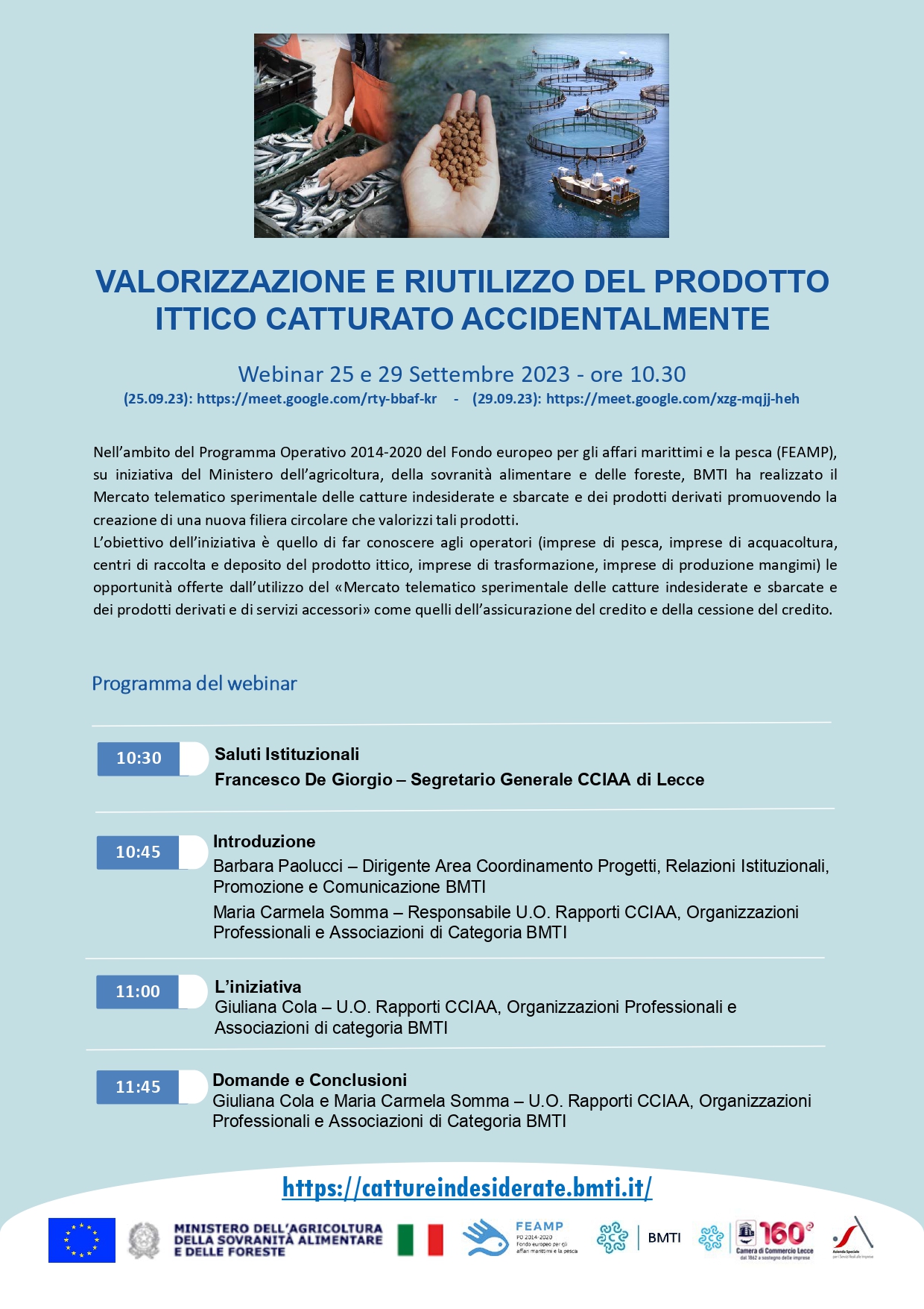 Nell'ambito delle attività progettuali, si terrà, nelle giornate del 25 e 29 settembre 2023, il webinar “Valorizzazione e riutilizzo del prodotto ittico catturato accidentalmente” con l’obiettivo di far conoscere agli operatori della pesca e dell’acquacoltura le opportunità offerte dall’utilizzo del «Mercato telematico sperimentale delle catture indesiderate e sbarcate e dei prodotti derivati e di servizi accessori» come quelli dell’assicurazione del credito e della cessione del credito.
