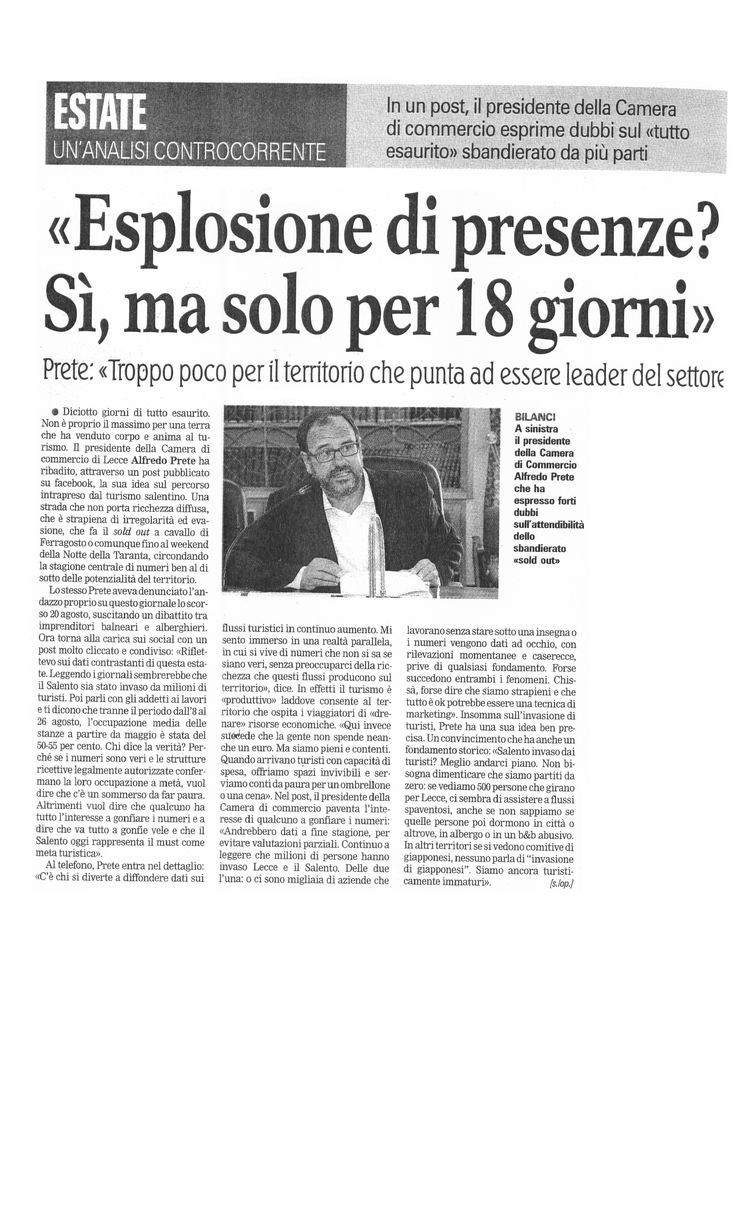 La Gazzetta del Mezzogiorno 02/09/2016 "Esplosione di presenze? Sì, ma solo per 18 giorni"